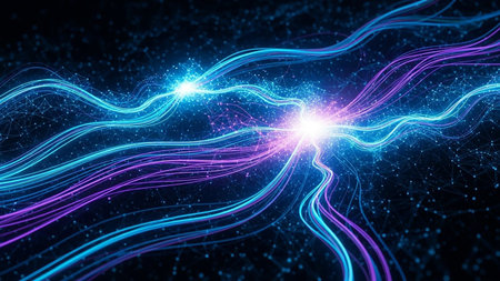 Bright blue and purple light trails intertwine and glow with energetic nodes against a dark background filled with a subtle network of connections.