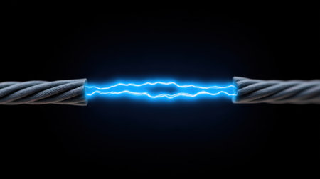 A stunning depiction of electric energy sparking between two wires, showcasing a bright blue light against a dark backdrop, perfect for illustrating power concepts.
