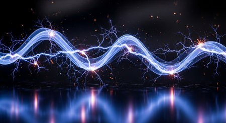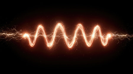 This vibrant illustration depicts an electric wave pulsing with bright energy, showcasing dynamic light effects against a deep black background.