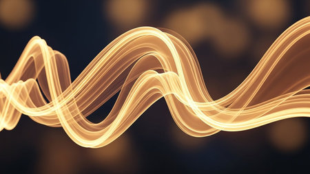 This image captures a mesmerizing display of golden light trails arranged in a sinuous, wave-like pattern against a dark background. The trails create an abstract, fluid motion that evokes a sense of dynamic energy and harmony.
