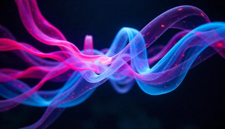 Abstract swirling trails of neon blue and pink light create a dynamic and futuristic background with a bokeh effect of small glowing particles.