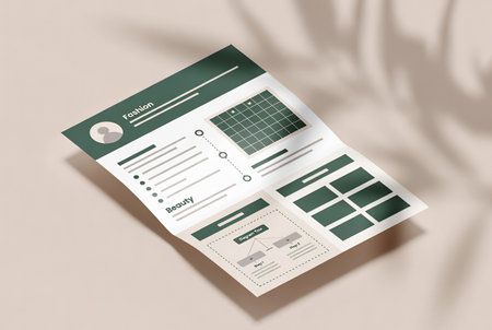 A serene workspace featuring a wooden table adorned with various documents, a decorative plant, and a coffee cup. Bright natural light enhances productivity and creativity.