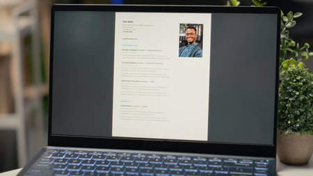Modern desk with laptop in empty office shows applicant CV before hiring interview, office used for the recruitment process and reviewing qualifications or work experience to align with position.