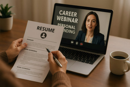 Applicant reviewing resume while attending an online career webinar for personal branding and job searching