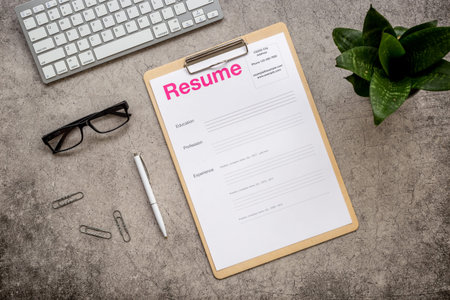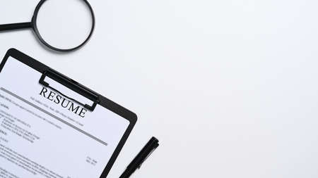 Businessman or job seeker review his resume on his desk before send to finding a new job with pen, necktie, glasses and digital tablet.