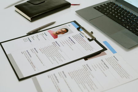 Closeup showing CV with portrait photo of young adult man on clipboard placed beside laptop, pen, and notebook on desk, highlighting job application or recruitment process