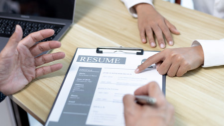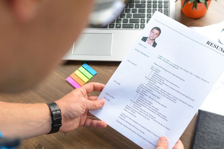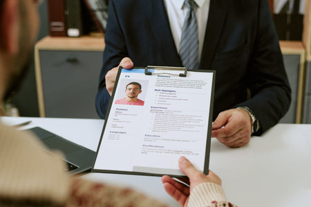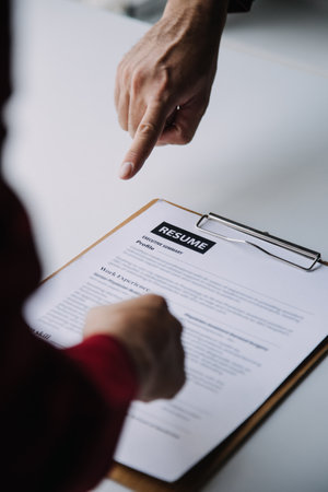 Close-up of interviewer examining resume of candidate for a new post during job interview