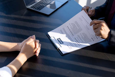 Person submitting resume to interview for a job with a company, Person attending a job interview with a manager to be recruited to the company for the position applied for. Job application concept.