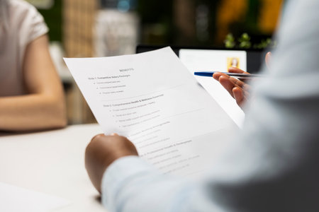 Close up of job seeker reviewing perks and benefits package for the company vacancy, career opportunity to help with professional growth. Woman studying details about the position.
