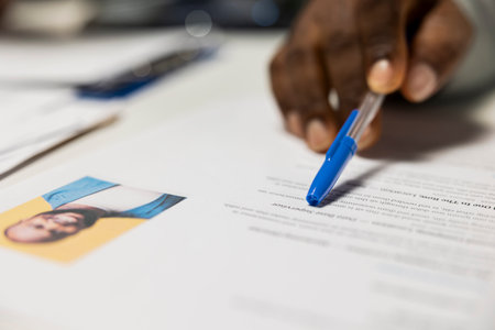 Close up of african american businesswoman evaluating a candidate CV resume with outstanding career background and great qualifications. Searching for a person fit for the business position.