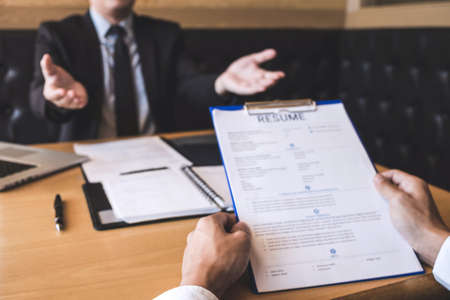 Employer or recruiter holding reading a resume during about his profile of candidate, employer in suit is conducting a job interview, manager resource employment and recruitment concept.