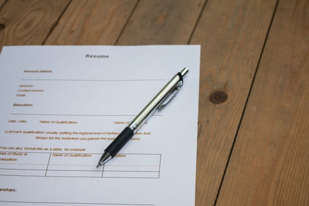 Top view of stack of office documents including resume and cv forms on the desk close to pen and notepad. Job seeking process. Hunting for workplace concept