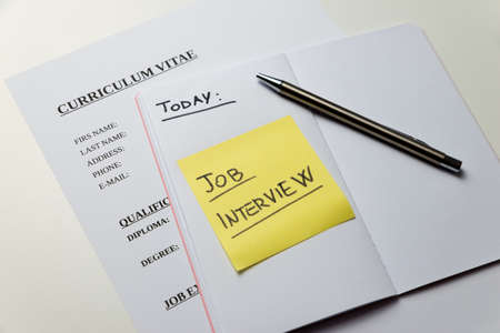 Curriculum vitae and notebook with yellow ticket and text today job interview. Job search and job interviews.