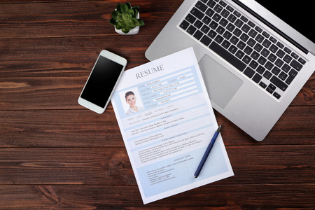 Top view of resume files on HR manager table. Reviewing resume applications. Searching for new employees.
