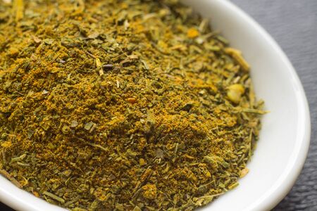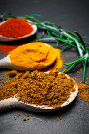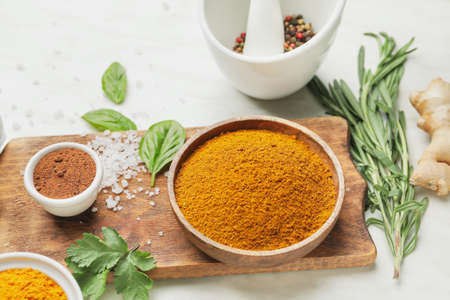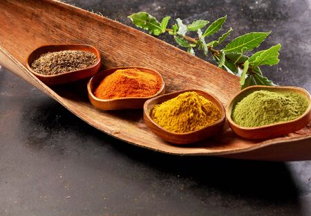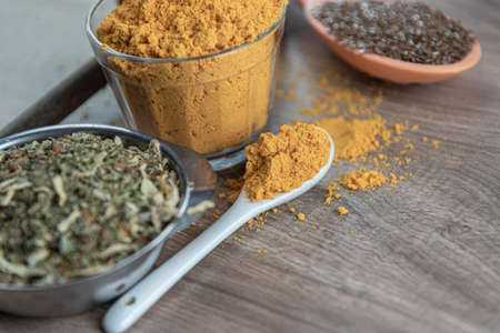Curry spice powder and herbs on a wooden spoon. Ingredients for cooking and seasoning.