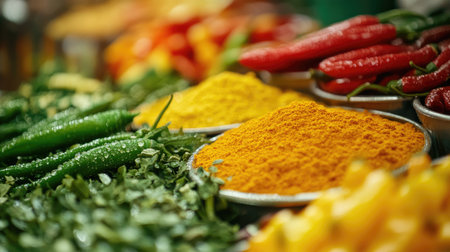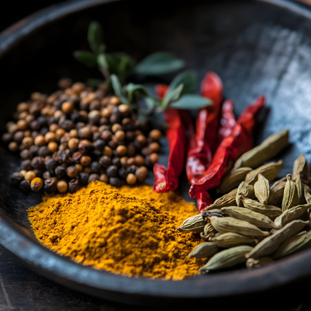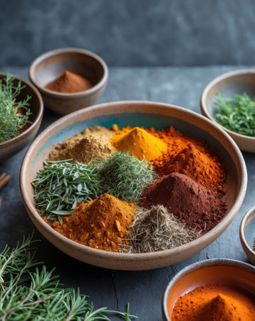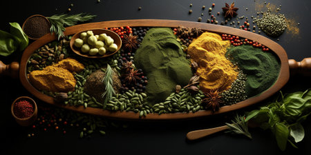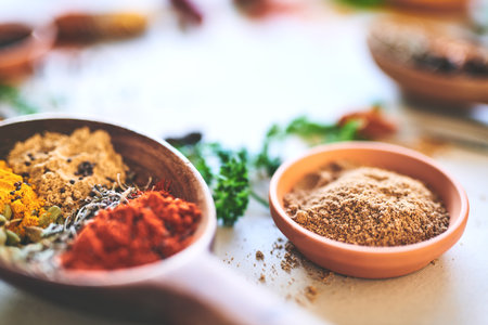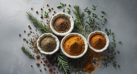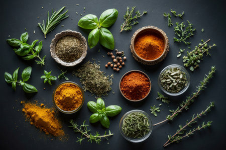 Fresh herbs and dried colorful spices in spoons and bowls arranged on one side with copy space