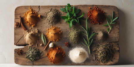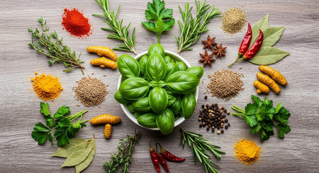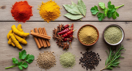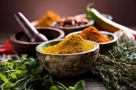 Spices and herbs on wooden background. Food and cuisine ingredients.