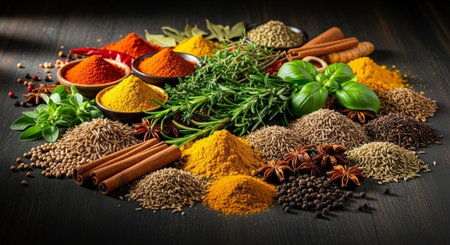 Colorful various of fresh and dried herbs, spices for cooking. Spice and herb seasoning, paprika powder, cinnamon, red onion. garlic, basil, ginger root on dark background.