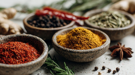 Spices and herbs in ceramic bowls on rustic wooden background with copyspace