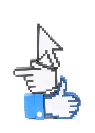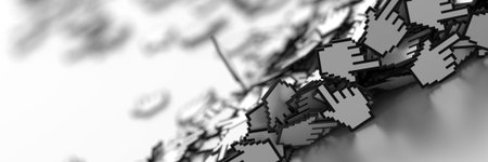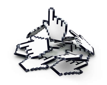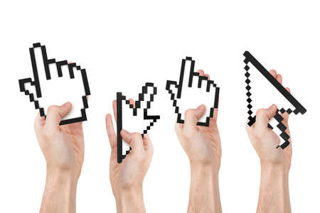 Group of hands holding computer mouse hand and arrow cursor symbols, isolated on white background.