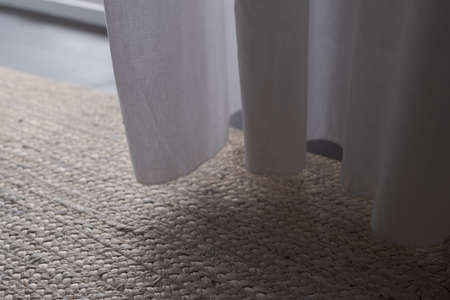 Closeup photo of jute rug on a floor with curtains on background