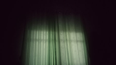 The background of the curtains on the green building window is dreamy because it is exposed to the sun