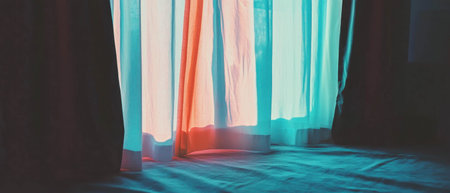 A serene scene featuring soft curtain fabric gently swaying in sunlight. The delicate texture enhances the tranquil ambiance, perfect for cozy interiors.