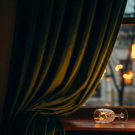 Velvet curtain in deep, rich color with a gold tassel tieback, creating a timeless, regal aesthetic in close-up detail.