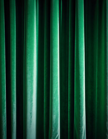 Curtain with soft smooth flowing folds. Deep green color and luxurious texture create a dramatic and elegant atmosphere. Decoration and interior design. Expensive curtain made of rich fabric. AI.