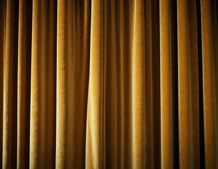 Curtain with soft smooth flowing folds. Deep golden color and luxurious texture create a dramatic and elegant atmosphere. Decoration and interior design. Expensive curtain made of rich fabric. AI.