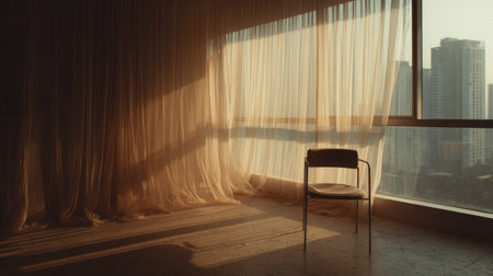 Soft morning light bathes a minimalistic chair near a window dressed in sheer curtains, creating a serene and tranquil atmosphere in a modern urban apartment.