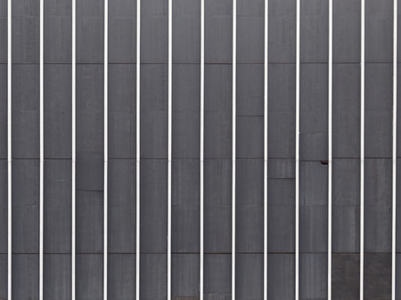 A view at a straight facade of a modern building with a dark gray facade. Dark gray metallic panel facade. Modern architectural details.