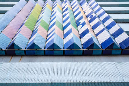 Details of gray facade made of aluminum panels windows on industrial building