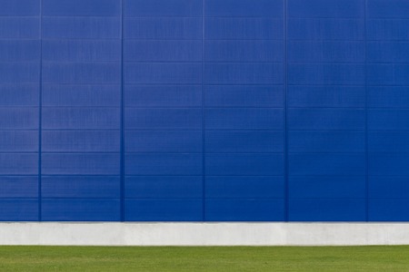 Mock up. Empty blue wall and green grass as background for photographers and design