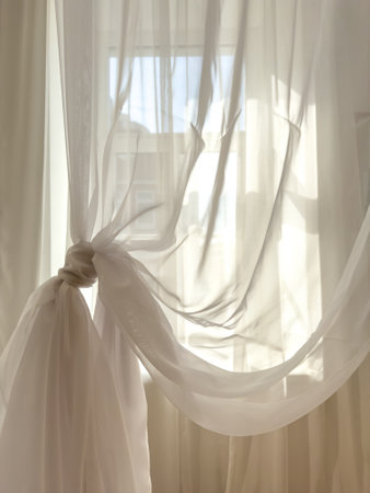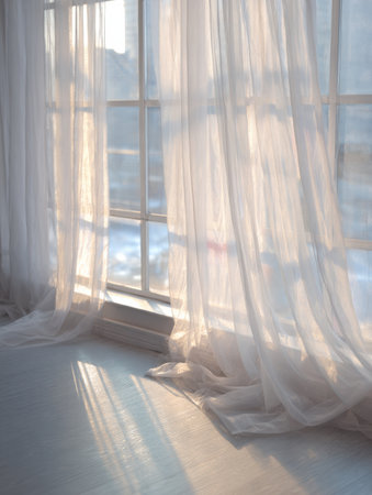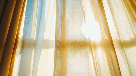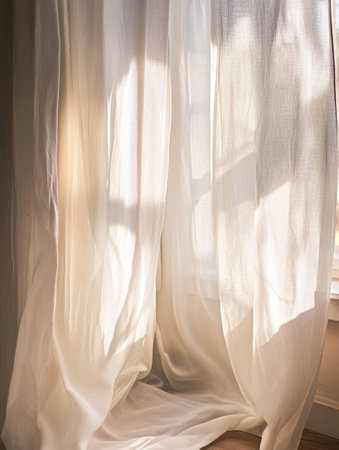 A serene scene featuring soft curtain fabric gently swaying in sunlight. The delicate texture enhances the tranquil ambiance, perfect for cozy interiors.