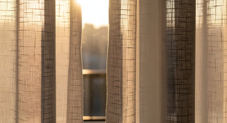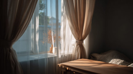 Soft sunlight shines through delicate curtains in a minimal room, creating a serene and warm ambiance perfect for relaxation and comfort.