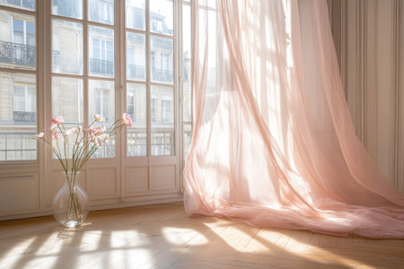 Pink sheer curtains blowing in the wind, in an elegant Parisian apartment with large windows and wooden floors, a flower vase on the floor, soft natural light, professional photography, pastel colors, minimalistic, no furniture or decor items, capturing its beauty and elegance, in the style of Hasselblad X2D camera. --ar 3:2 --v 6.1 Job ID: 00f78eaf-4db2-4907-8bf8-2910035ff46f