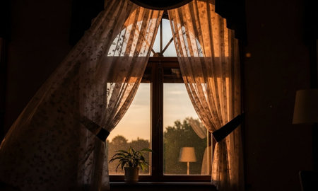 A pair of golden curtains gently sways in the breeze, letting soft natural light filter through, creating a warm and inviting indoor atmosphere.