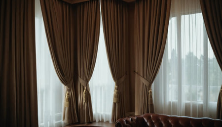 Rich, expensive silk curtains in deep brown frame a bright, airy window, enhancing the elegance of a well-appointed living area with tasteful decor and soft lighting.
