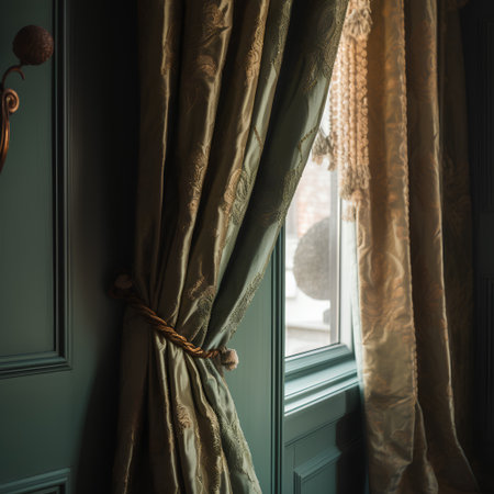 Rich silk curtains adorn a spacious room, their intricate design draping elegantly. Soft sunlight streams through, illuminating the ambiance and inviting tranquility into the space.