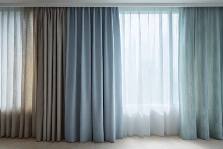 A collection of curtains drapes gracefully, showcasing a blend of rich colors and textures. The fabric panels catch soft daylight, enhancing the room's inviting atmosphere. Generative AI.