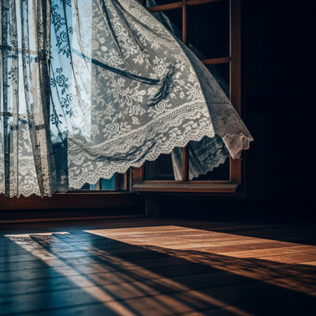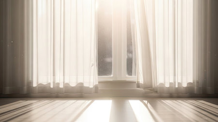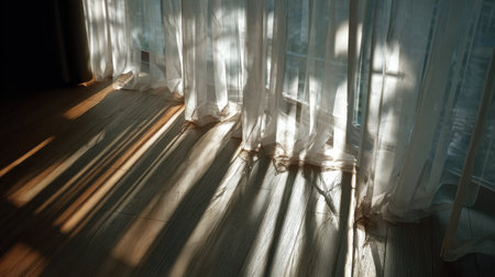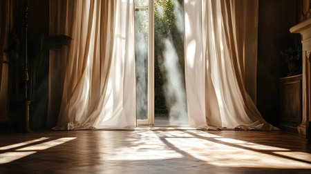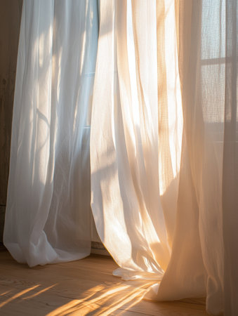 Gentle sunlight streams in through flowing white curtains, illuminating the peaceful interior and wooden floor.