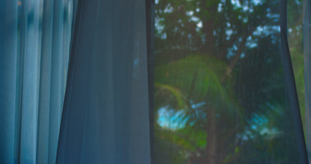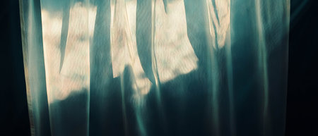 Sun light shines through transparent curtain. Waving white tulle near the window. Morning sun lighting the room, shadow background overlays.