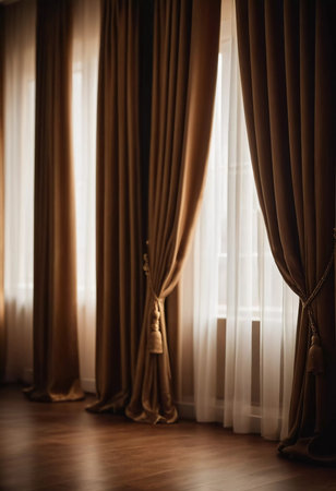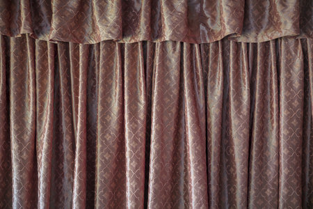 Elegant brown patterned curtains with pleated fabric texture create sophisticated interior backdrop. Rich decorative drapes perfect for home decor, interior design backgrounds.