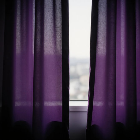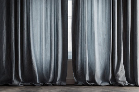 Dark, textured curtains hang by a window, gently drawn back to allow soft light to fill the room.