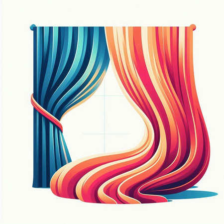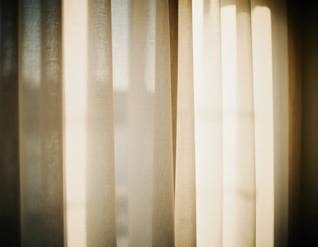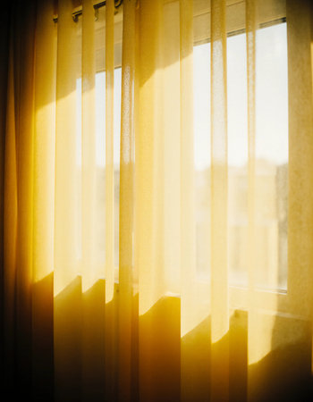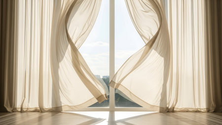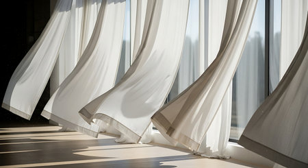 Transparent silk curtains in monochrome light effect floating from an open window, shadows from window blinds reflected on the textile.