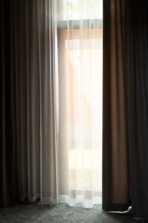 Defocused curtain window with sunlight in the early morning. For montage product display or design key visual layout