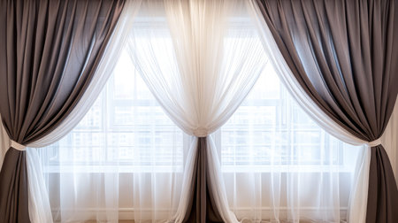 Modern dark hotel room, sheer curtains gently frame a window. The ambiance tranquility, perfect for relaxation during travels. Nobody. copy space