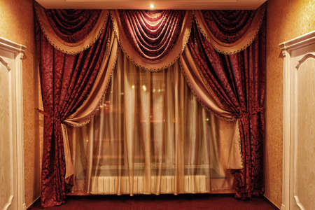 Beautiful red curtains on the window and transparent tulle fabric between them. View of daytime street. Background, texture, location, cozy room, and interior.