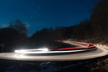 Cars light trails on a winding road at night. Long exposure image of a highway in the dark